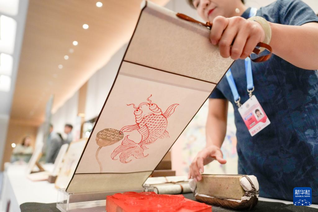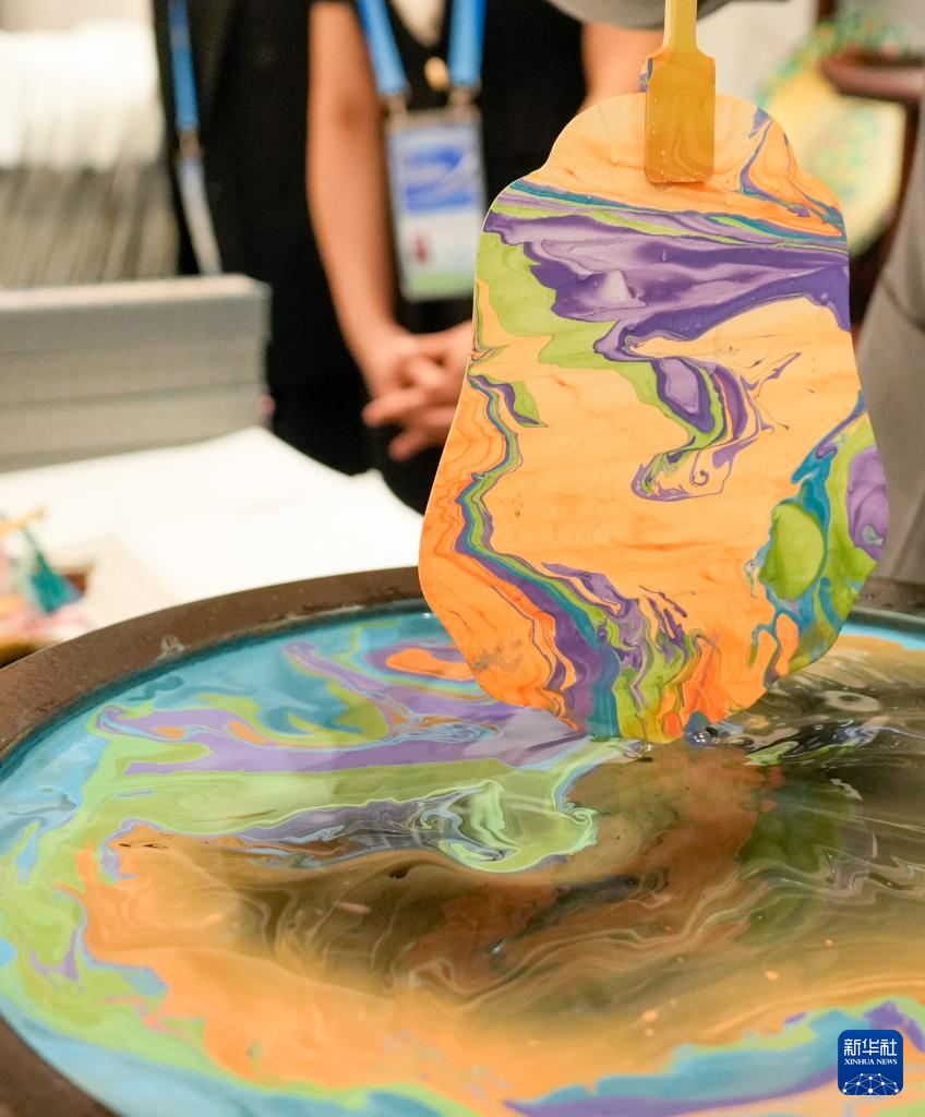 8月31日晚,贵宾们在欢迎宴会前体验制作漆扇。