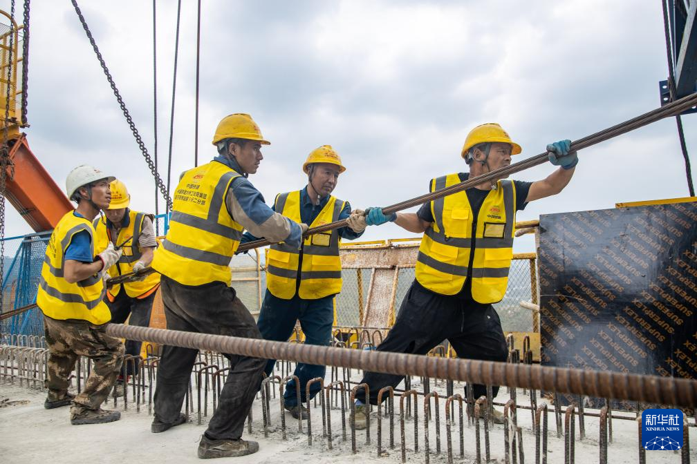 8月31日,工人在渝万高铁蔡家沟双线特大桥建设现场施工作业。