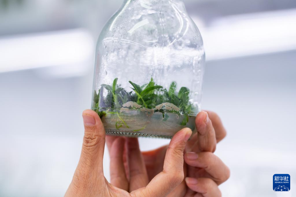 8月27日,工作人员在广南县岜夺社区一处铁皮石斛组培基地查看铁皮石斛苗生长情况。