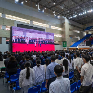9月3日,澳门社会各界在澳门理工大学体育馆观看纪念中国人民抗日战争暨世界反法西斯战争胜利80周年大会直播。