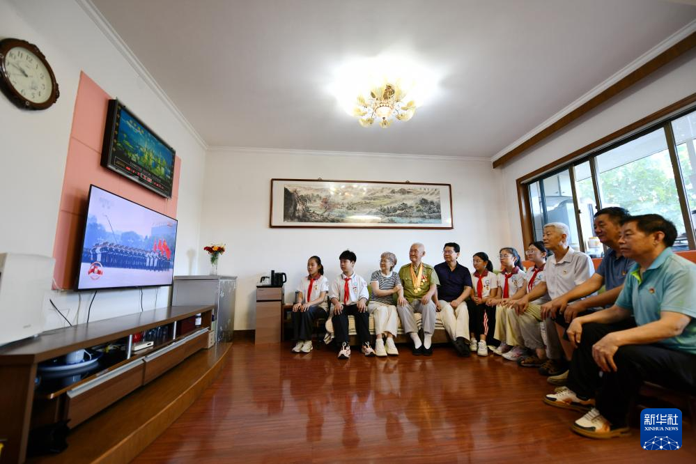 9月3日,在山西省阳泉市抗战老兵温云甫家中,温云甫(左四)和家人、社区工作人员及学生一起观看纪念中国人民抗日战争暨世界反法西斯战争胜利80周年大会直播。