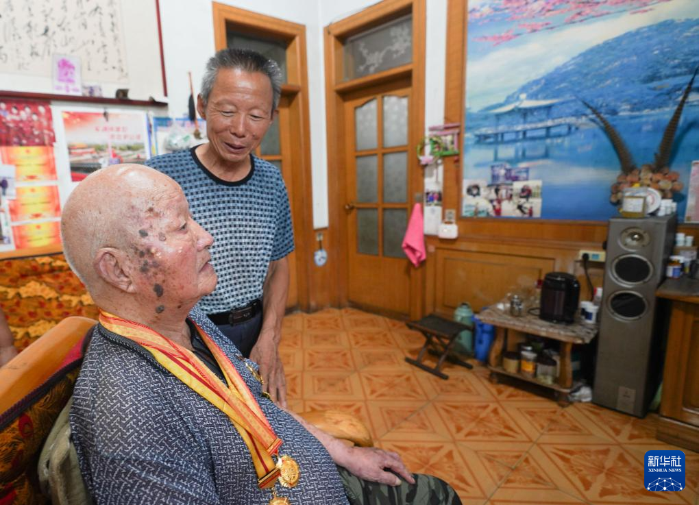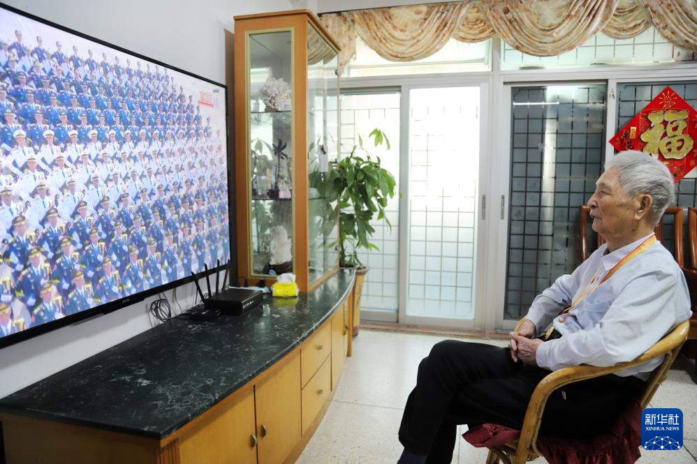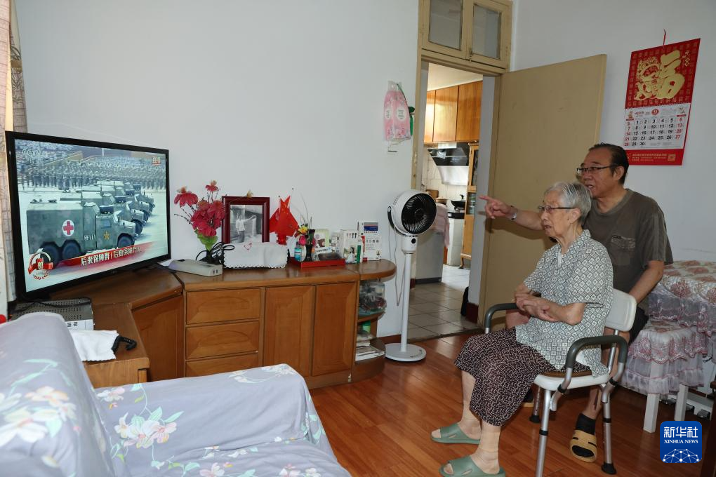9月3日,广东汕头102岁的抗战老兵陈天在家中观看纪念中国人民抗日战争暨世界反法西斯战争胜利80周年大会直播。