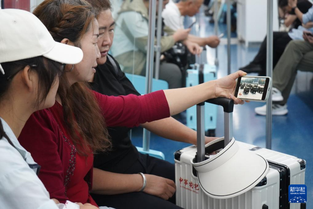 9月3日,在陕西省西安市地铁1号线车厢,乘客通过手机观看纪念中国人民抗日战争暨世界反法西斯战争胜利80周年大会直播。