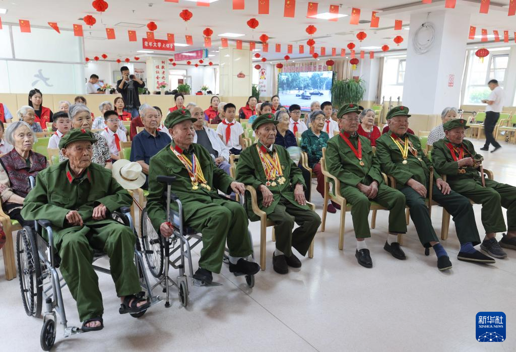 9月3日,在位于山东省临沂市沂南县大庄镇的“山东抗战老兵照护中心”,老兵们和志愿者、少先队员一起观看纪念中国人民抗日战争暨世界反法西斯战争胜利80周年大会直播。