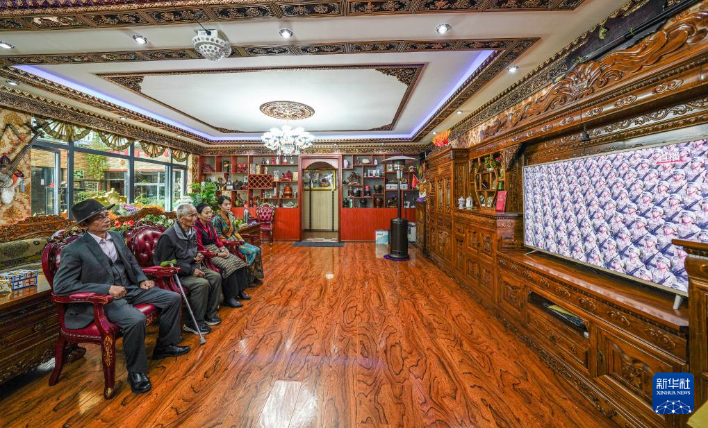 9月3日,西藏拉萨市达孜区团结社区洛追晋美(左二)一家人在观看纪念中国人民抗日战争暨世界反法西斯战争胜利80周年大会直播。
