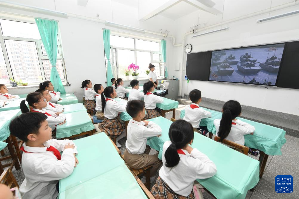 9月3日,哈尔滨市杨靖宇红军小学师生在观看纪念中国人民抗日战争暨世界反法西斯战争胜利80周年大会直播。