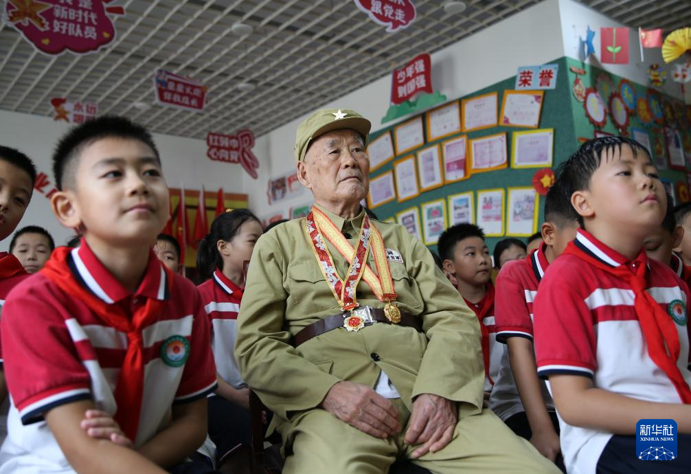 9月3日,在山东省临沂市郯城县东方红小学,抗战老战士王开昌与小学生们一起观看纪念中国人民抗日战争暨世界反法西斯战争胜利80周年大会直播。