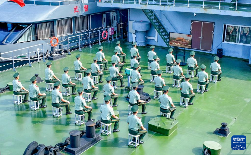 9月3日,武警江苏总队南京支队船艇大队官兵观看纪念中国人民抗日战争暨世界反法西斯战争胜利80周年大会直播。