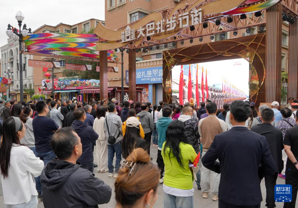 9月3日,在乌鲁木齐大巴扎步行街,居民和游客一起观看纪念中国人民抗日战争暨世界反法西斯战争胜利80周年大会直播。