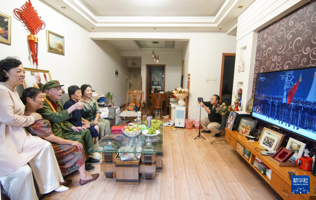 9月3日,江苏海安抗战老兵王承坚和家人一起收看纪念中国人民抗日战争暨世界反法西斯战争胜利80周年大会直播。