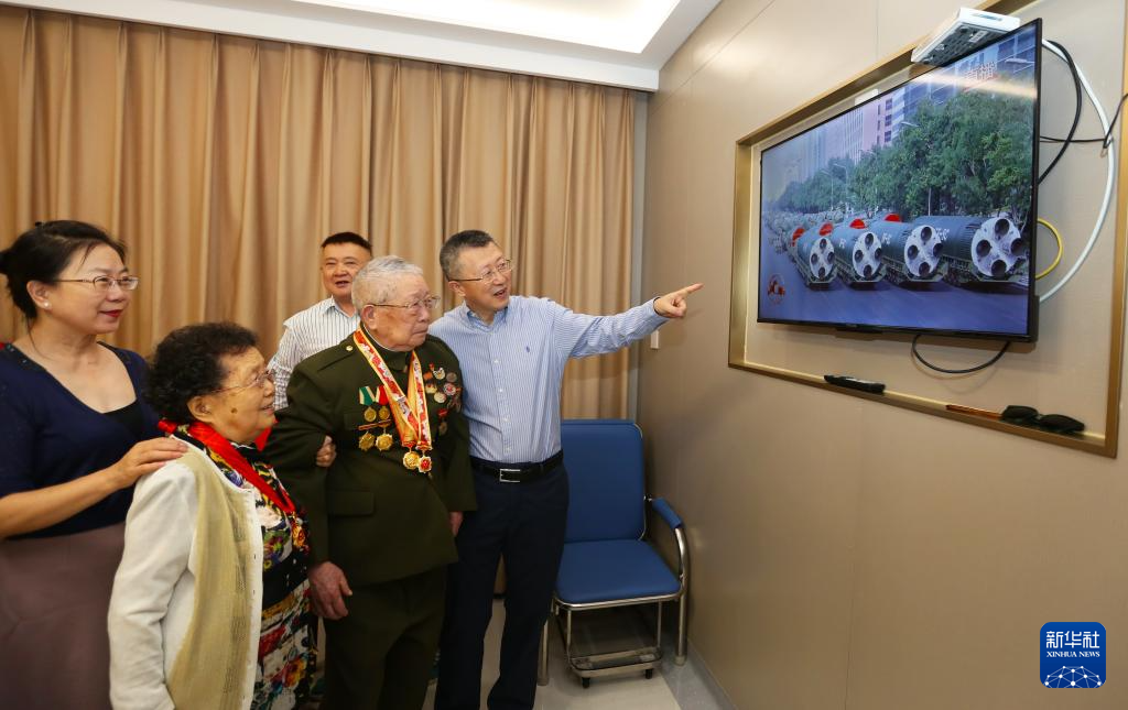 9月3日,在四川成都,96岁的八路军老战士许家海(右二)在家人的陪伴下观看纪念中国人民抗日战争暨世界反法西斯战争胜利80周年大会直播。