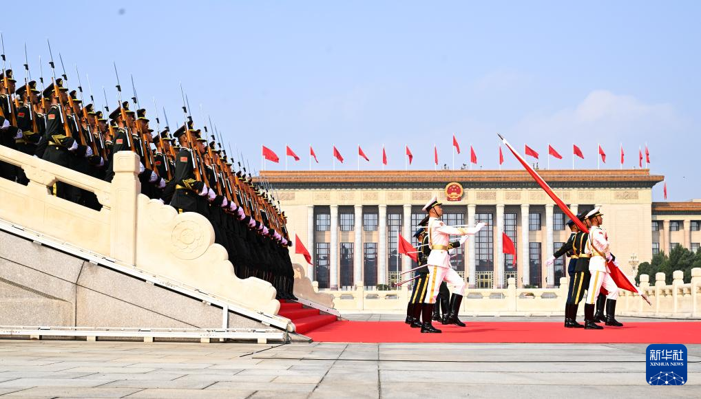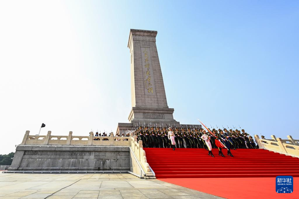 9月3日,纪念中国人民抗日战争暨世界反法西斯战争胜利80周年大会在北京隆重举行。这是国旗护卫队从人民英雄纪念碑基座出发,走向旗杆基座。