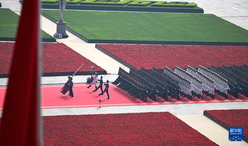 9月3日,纪念中国人民抗日战争暨世界反法西斯战争胜利80周年大会在北京隆重举行。这是国旗护卫队官兵护卫着五星红旗,从人民英雄纪念碑行进至广场北侧升旗区。