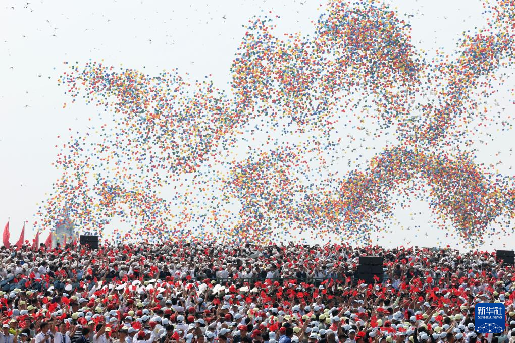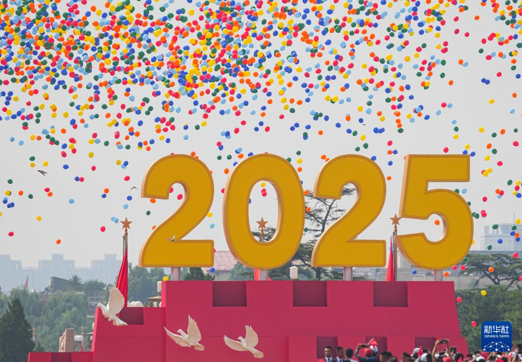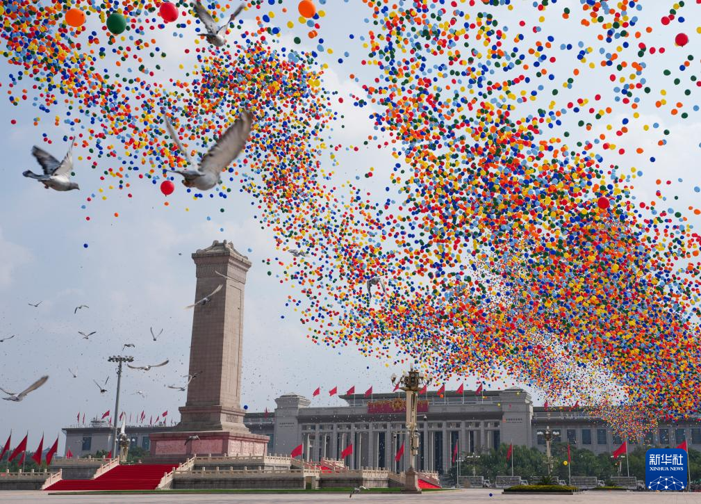 9月3日,纪念中国人民抗日战争暨世界反法西斯战争胜利80周年大会在北京隆重举行。这是纪念大会现场放飞气球。