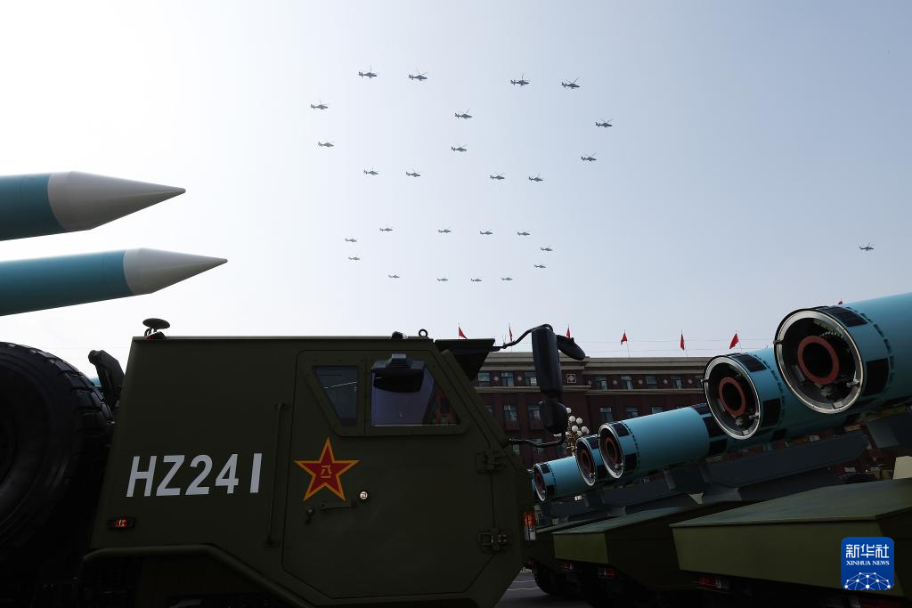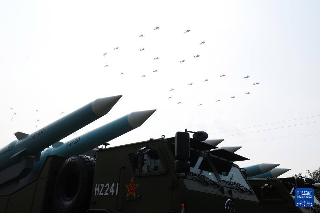 9月3日,纪念中国人民抗日战争暨世界反法西斯战争胜利80周年大会在北京隆重举行。这是空中护旗梯队从反舰导弹方队上空飞过。