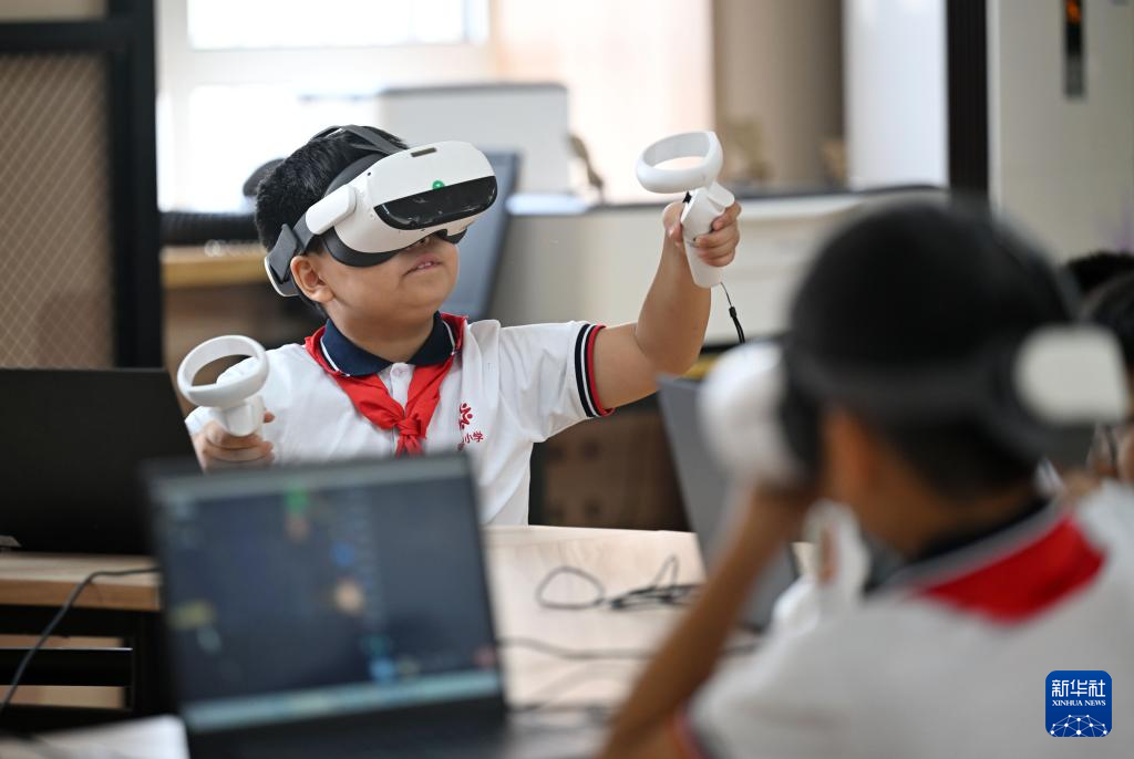 9月4日,天津市和平区新星小学学生在AI未来体验中心体验VR设备。