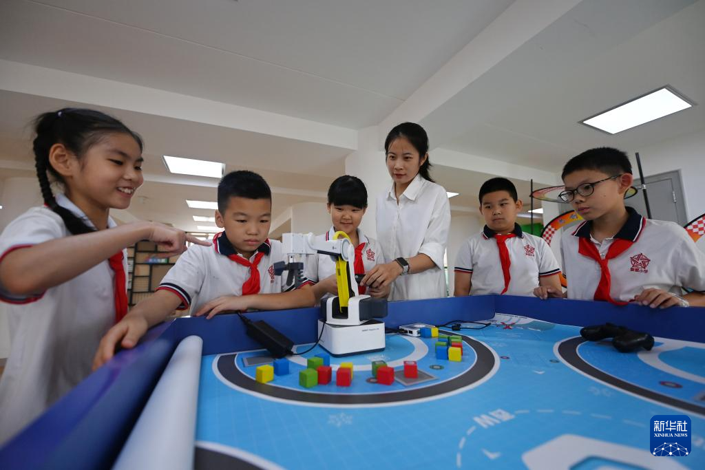 9月4日,在天津市和平区新星小学,老师指导学生操控模拟机械臂。