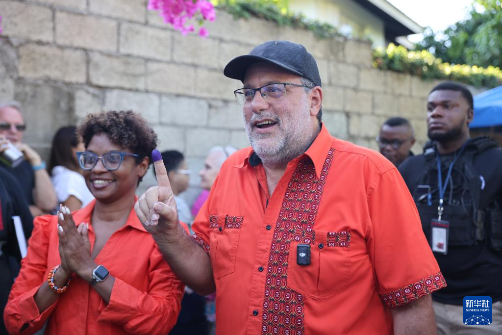 9月3日,在牙买加首都金斯敦一处投票站,人民民族党领袖马克·戈尔丁在投票后展示手指上的墨水。