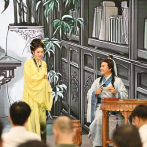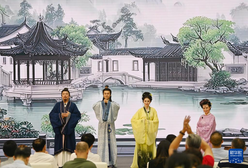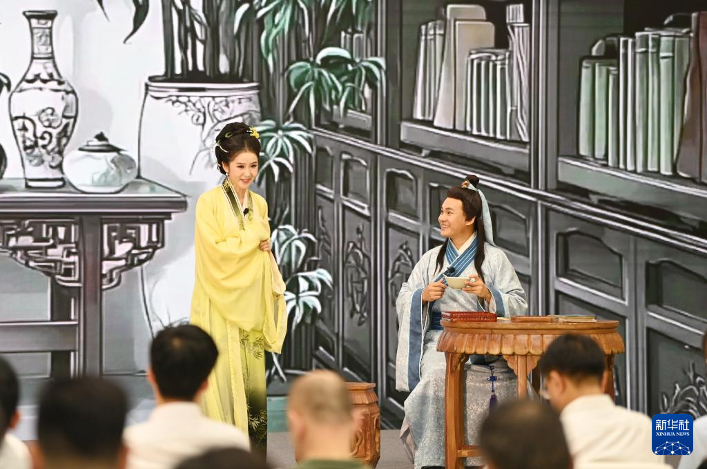 9月5日,演员在新闻发布会上表演话剧《钗头凤》片段。