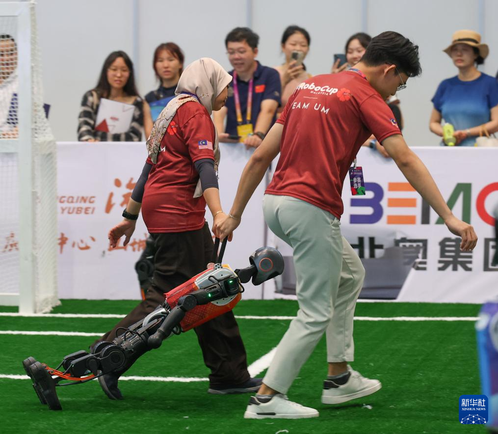 9月5日,在机器人3V3足球赛中,工作人员将故障机器人抬出场外。