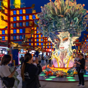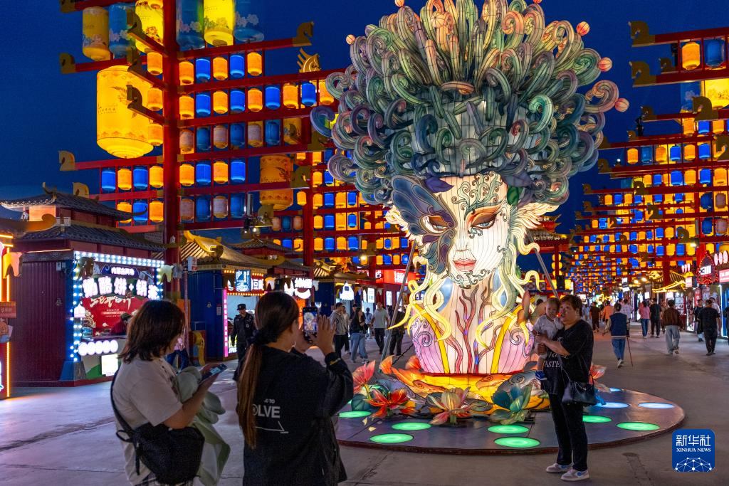 9月4日,在内蒙古乌兰察布市“乌兰察布之夜”特色街区,游客们在花灯前留影。