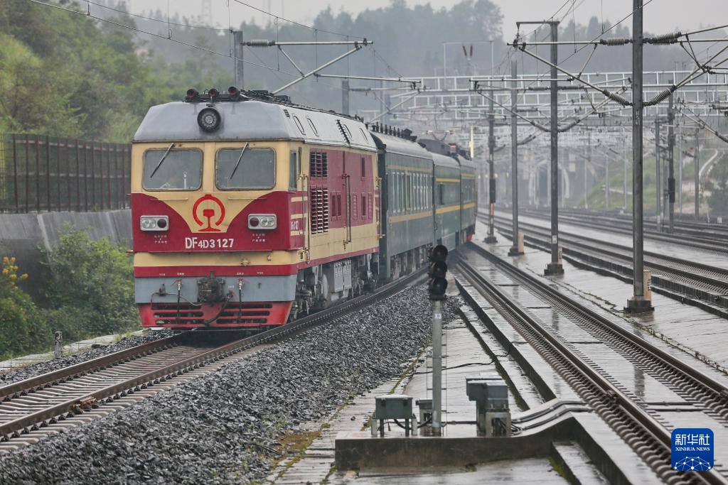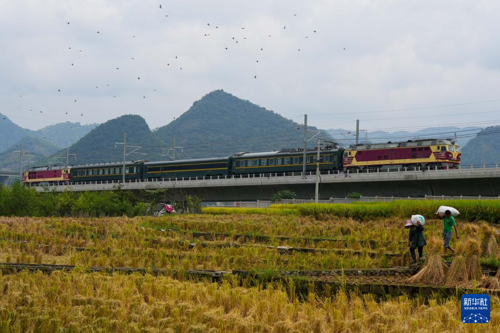 9月6日,在贵州省盘州市,盘兴高铁联调联试检测列车从盘州站驶出。