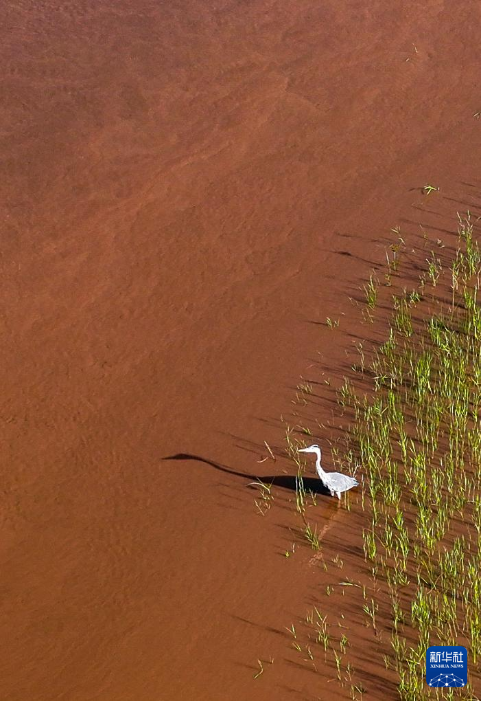 9月6日,一只苍鹭在宁夏石嘴山市平罗县境内的黄河滩涂湿地觅食(无人机照片)。