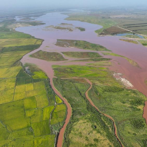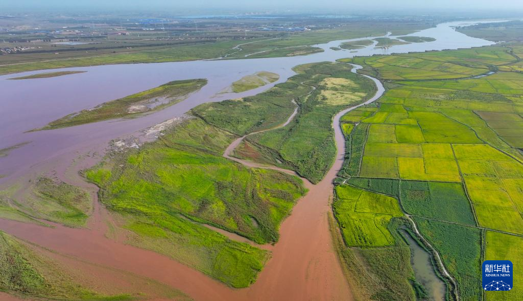 这是9月6日在宁夏石嘴山市平罗县境内拍摄的黄河滩涂湿地和稻田(无人机照片)。