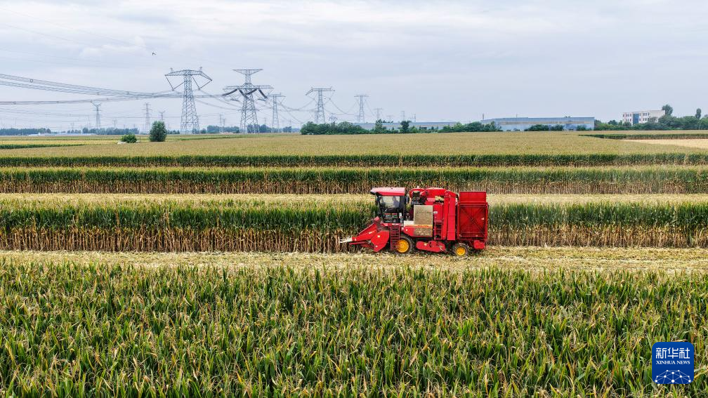 9月5日,农民驾驶联合收割机在山东省东营市广饶县李鹊镇黄东村的高标准农田收割玉米(无人机照片)。