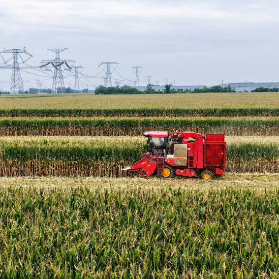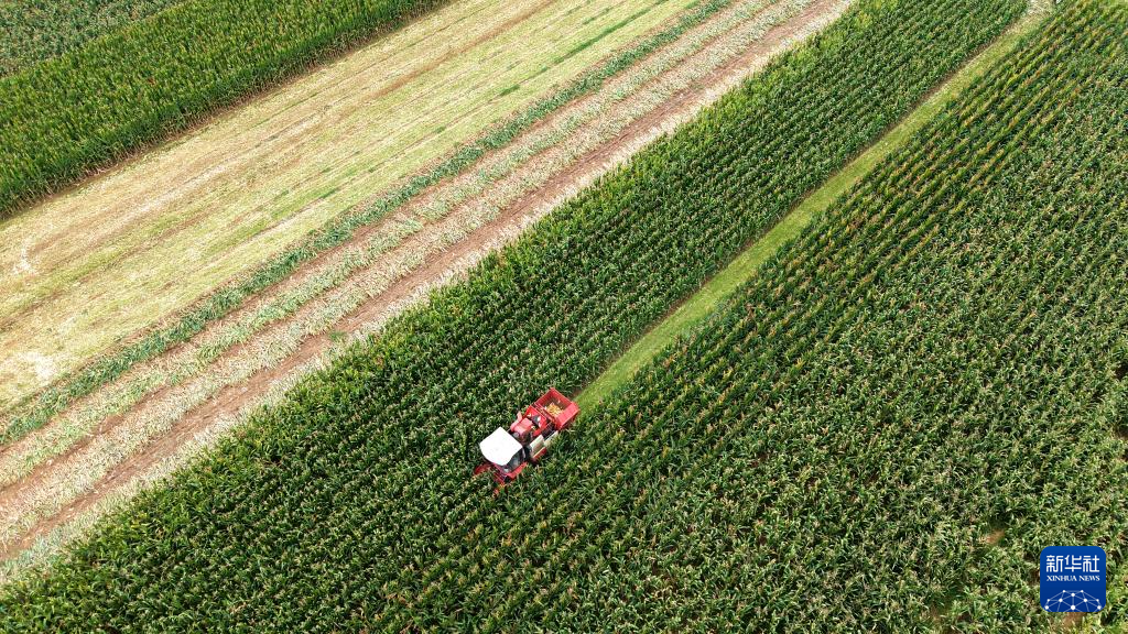 9月5日,山东省临沂市平邑县临涧镇农民驾驶农机在田间收获玉米(无人机照片)。