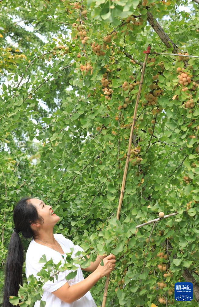 9月6日,云南省腾冲市固东镇江东村村民用竹竿打落银杏果。固东镇江东村1万余亩银杏迎来丰收。