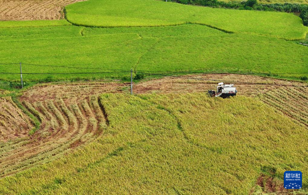 9月6日,在湖南省永州市道县营江街道芒头寨村,农机手驾驶农机收割水稻。