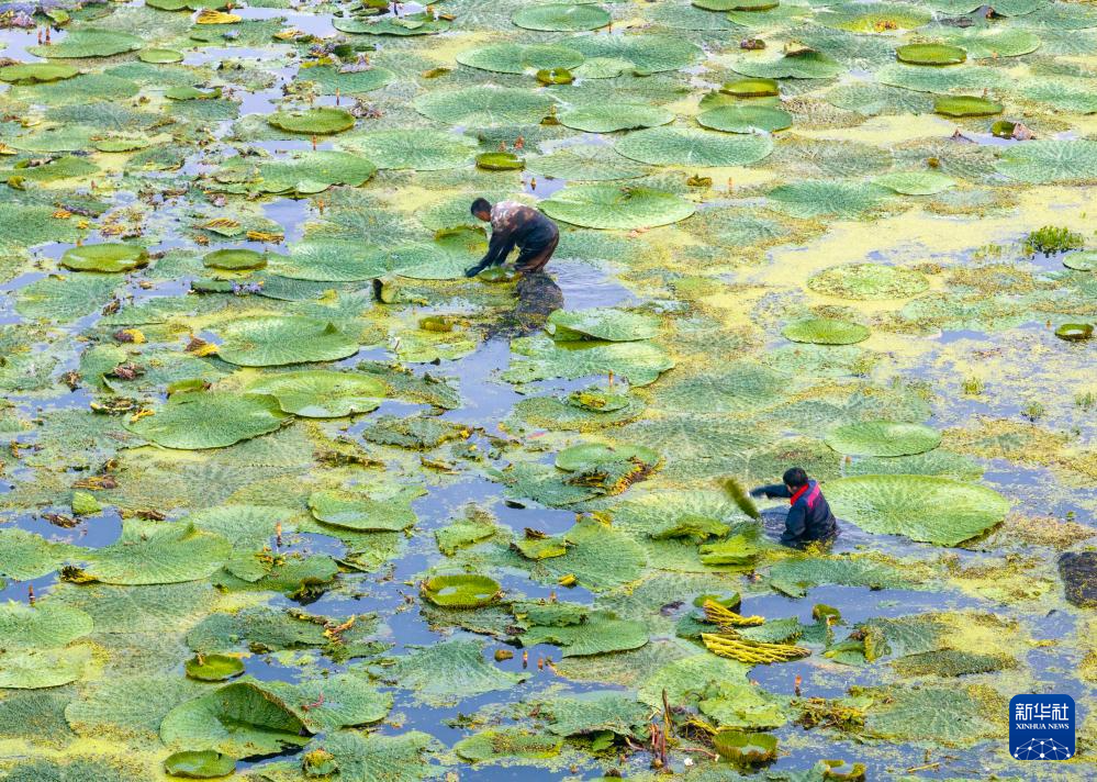 9月6日,农民在江苏省泰州市姜堰区顾高镇申俞村采收芡实(无人机照片)。