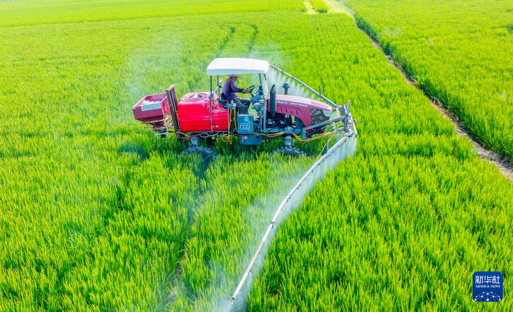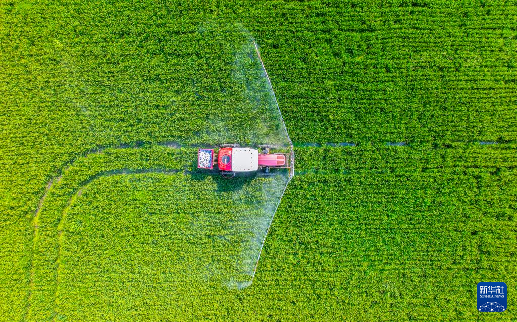 9月6日,在江苏省海安市角斜镇范堑村,村民驾驶植保机械在水稻田里进行喷洒药物作业(无人机照片)。