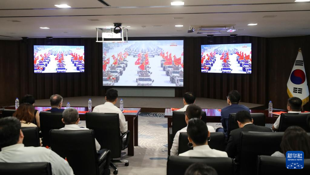 9月3日,在韩国首尔,华侨华人等观看纪念中国人民抗日战争暨世界反法西斯战争胜利80周年大会直播。