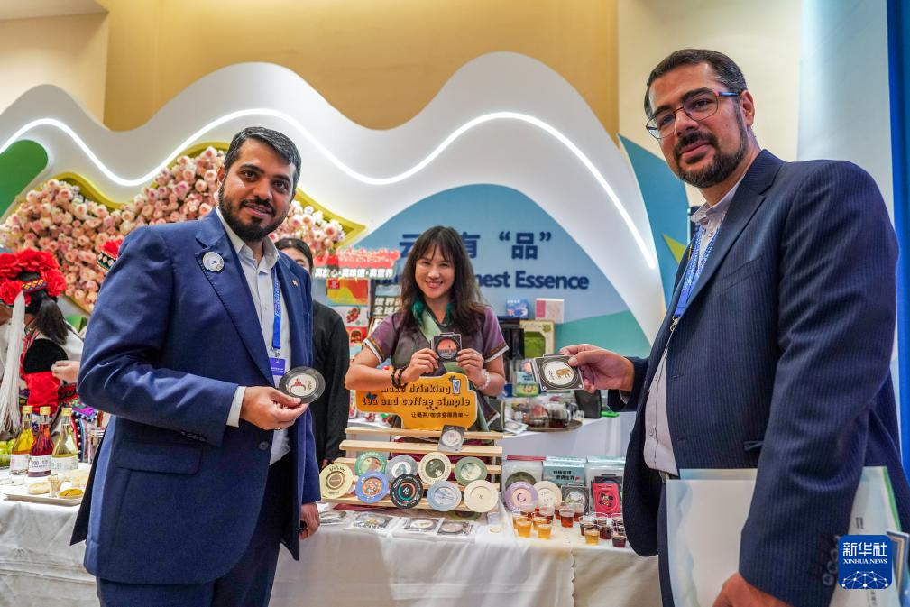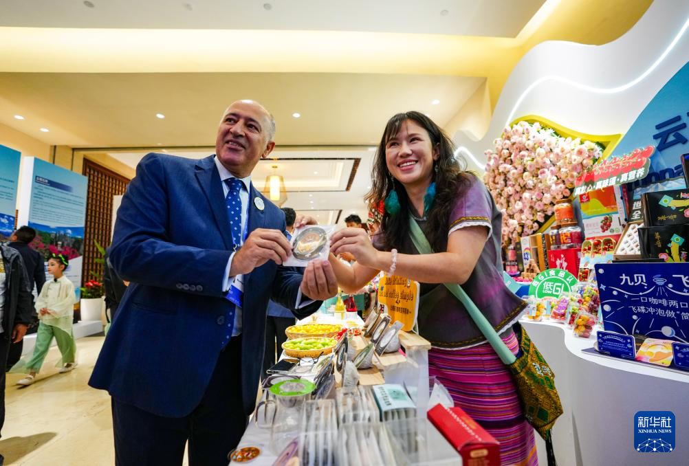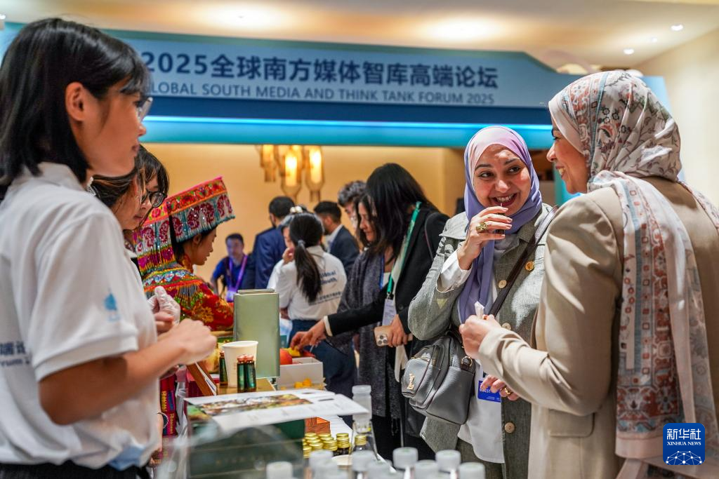 9月6日,出席2025全球南方媒体智库高端论坛的代表在开幕式会场品尝特产。