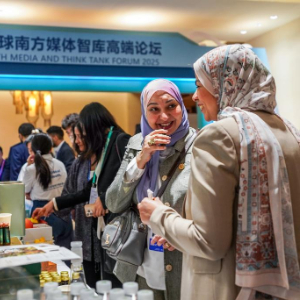 9月6日,出席2025全球南方媒体智库高端论坛的代表在开幕式现场交谈。