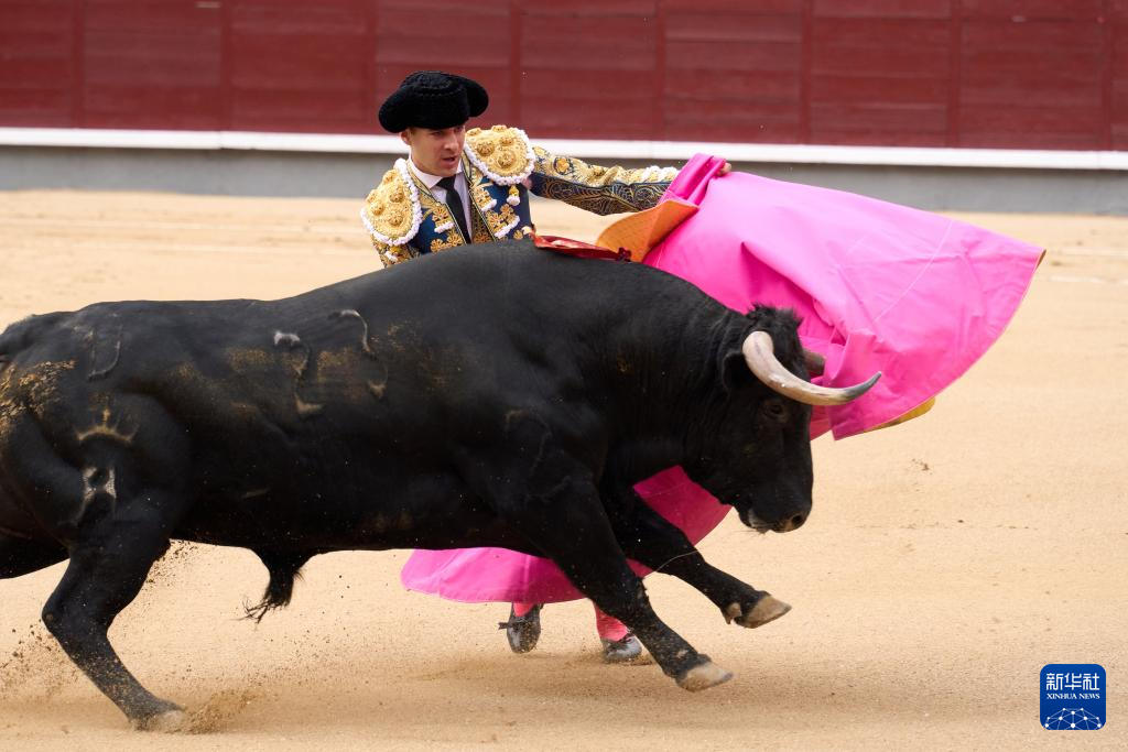 9月7日,一名斗牛士在西班牙马德里拉斯本塔斯斗牛场内进行斗牛表演。