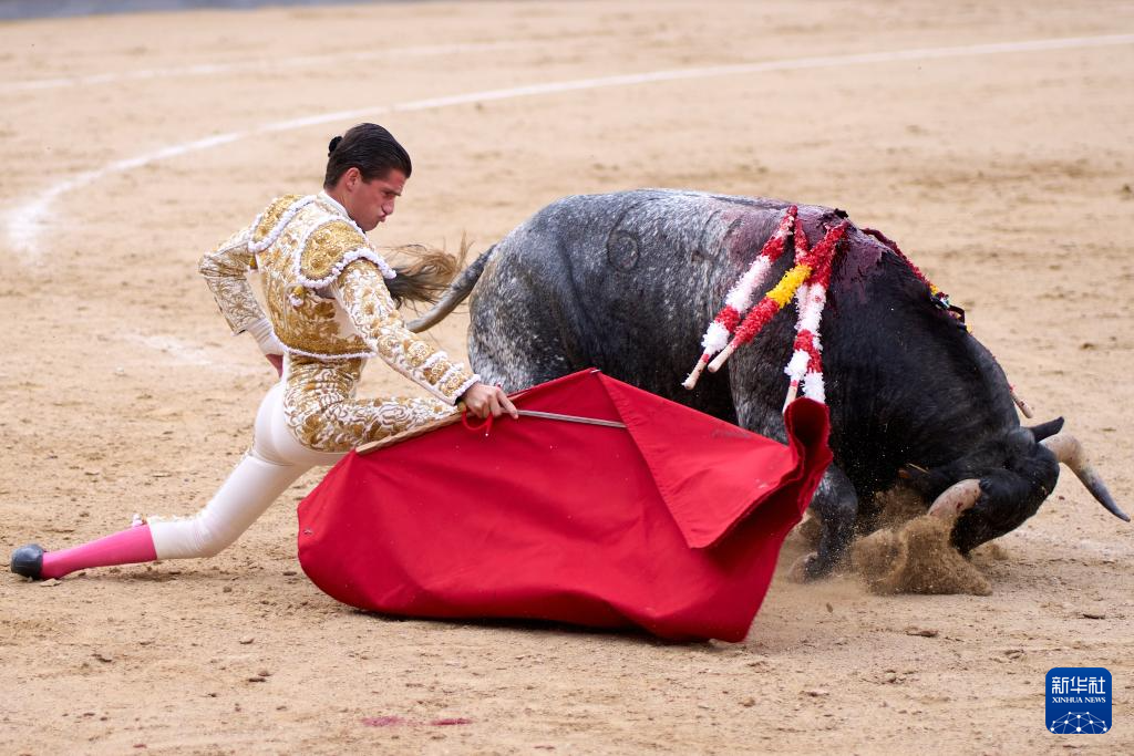 9月7日,一名斗牛士在西班牙马德里拉斯本塔斯斗牛场内的斗牛表演中与公牛对视。