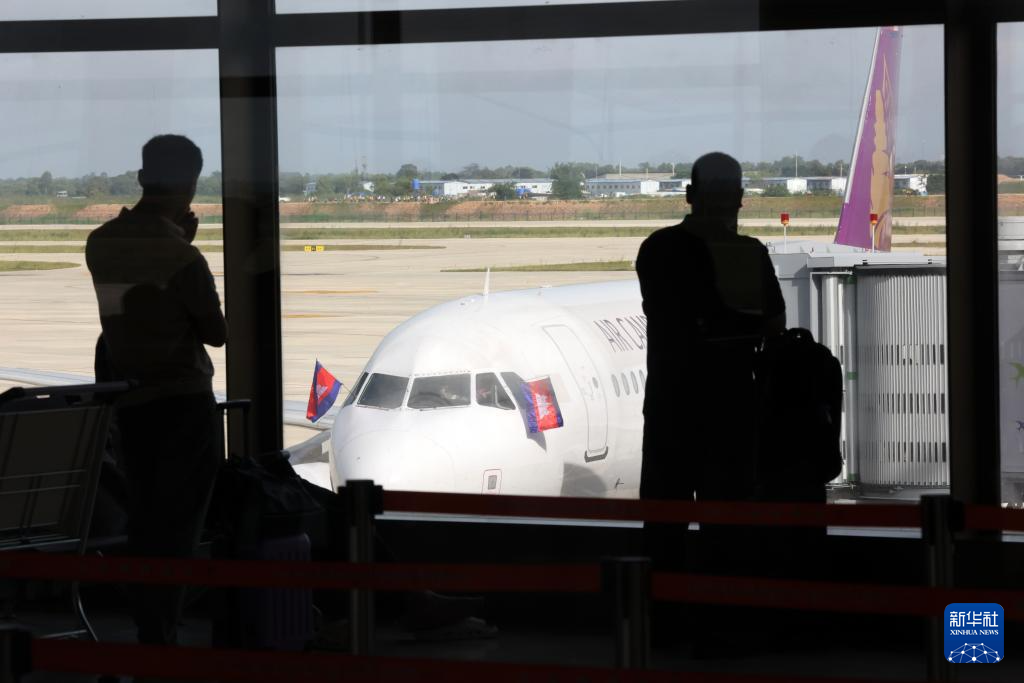 9月9日,在柬埔寨干丹省,乘客在德崇国际机场的候机楼内观看客机停靠。