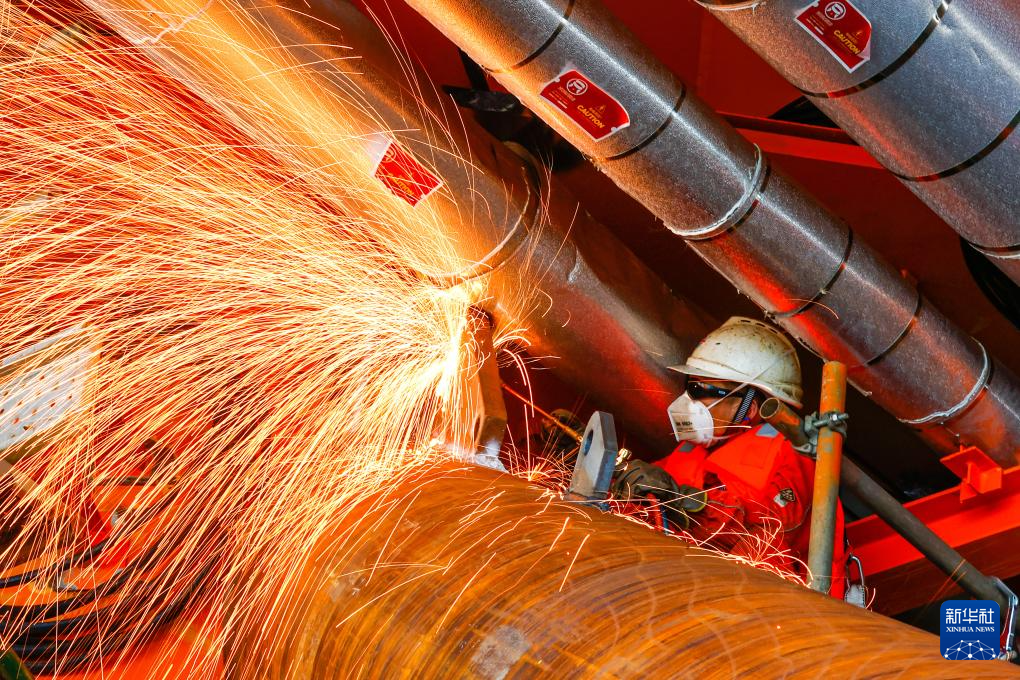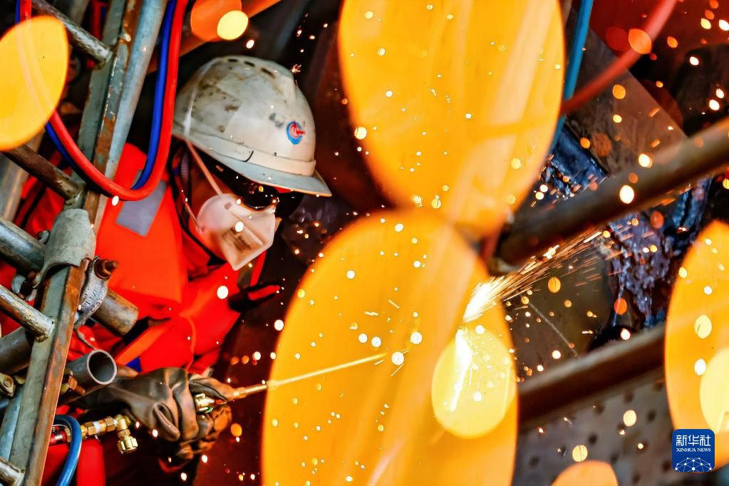 9月8日,工人在垦利6-1油田10-1北区块Ⅱ期开发项目油气平台安装作业现场进行切割作业。