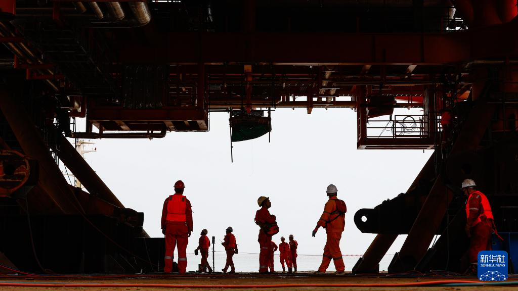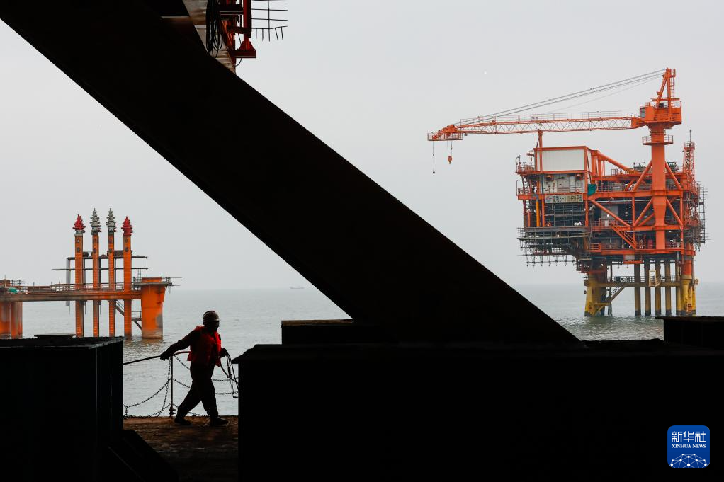 9月8日,工人穿梭在垦利6-1油田10-1北区块Ⅱ期开发项目油气平台安装作业现场。