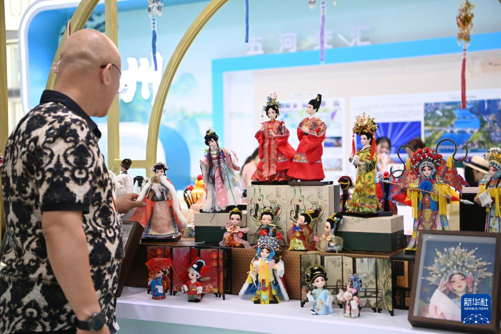 9月9日,参展商在服贸会展厅整理国家级非物质文化遗产北京绢人展品。