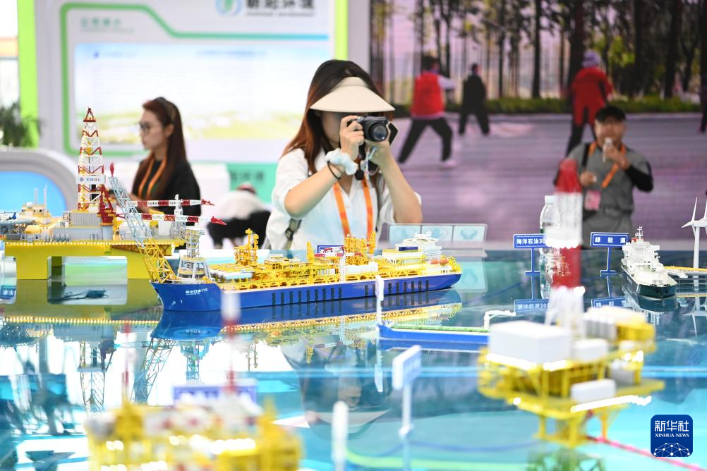 9月9日,参观者在服贸会展厅的中国海油展台参观。