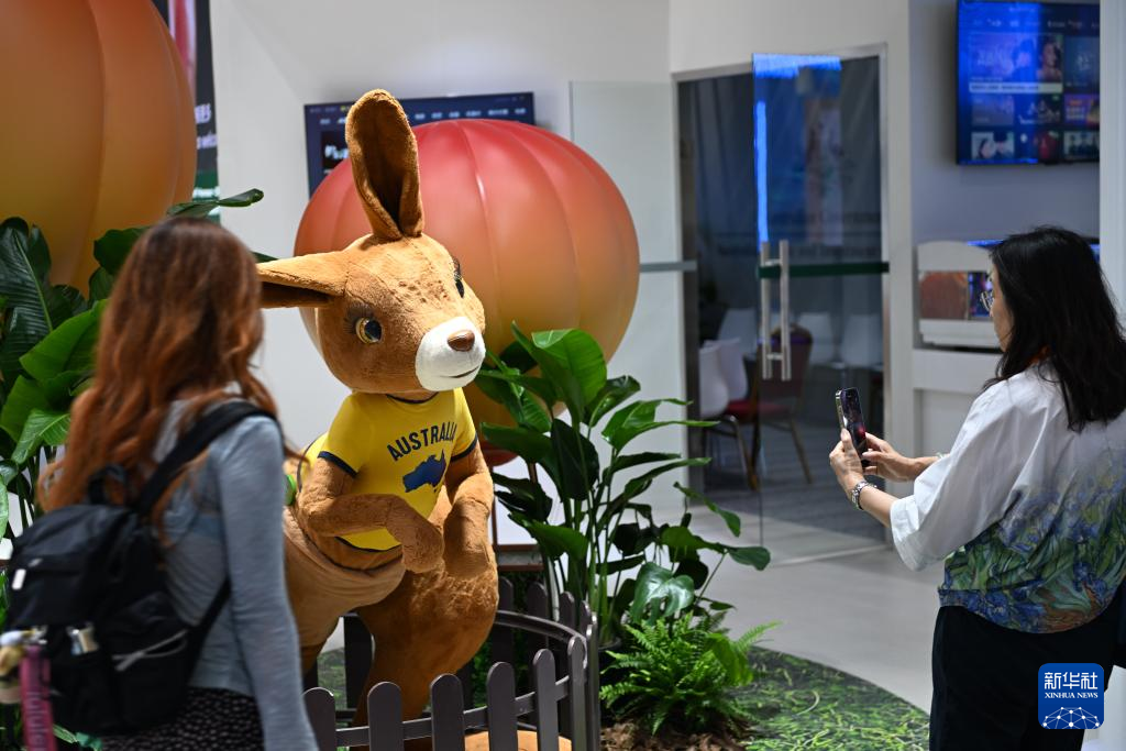 9月9日,一名女子拍摄本届服贸会主宾国澳大利亚展台上的袋鼠玩偶。