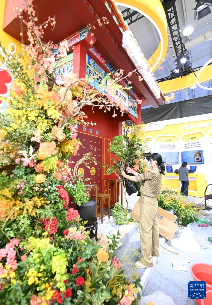 9月9日,服贸会文旅服务专题展的工作人员在布置展区。