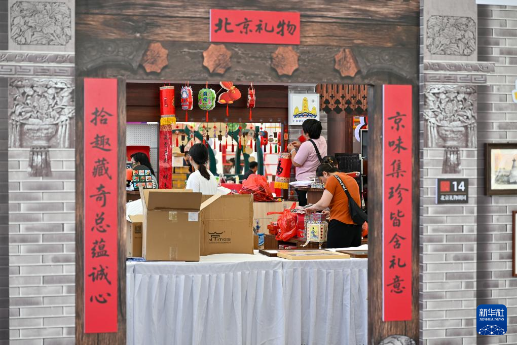 9月9日,参观者在服贸会展厅的北京东城展位参观文创产品。