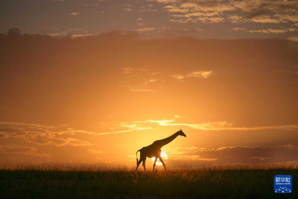 9月1日日出时分,在肯尼亚马赛马拉国家保护区,一只长颈鹿在草原上行走。