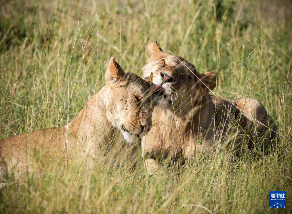 9月7日,在肯尼亚马赛马拉国家保护区,一头狮子为同伴舔毛。