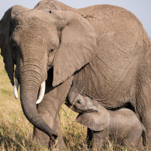 9月7日,在肯尼亚马赛马拉国家保护区,一头小象在母象腹下寻乳。